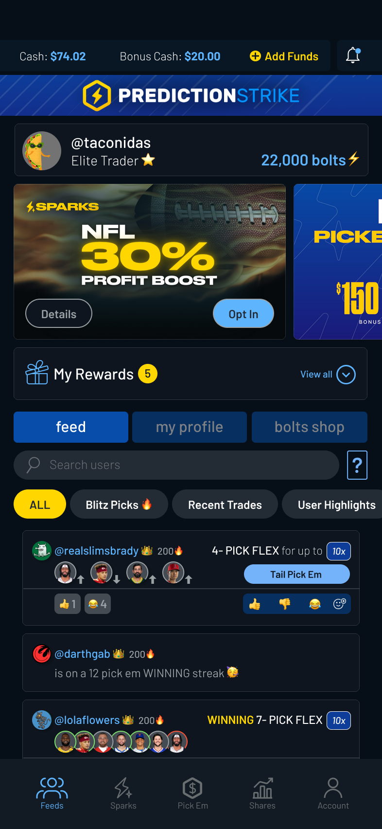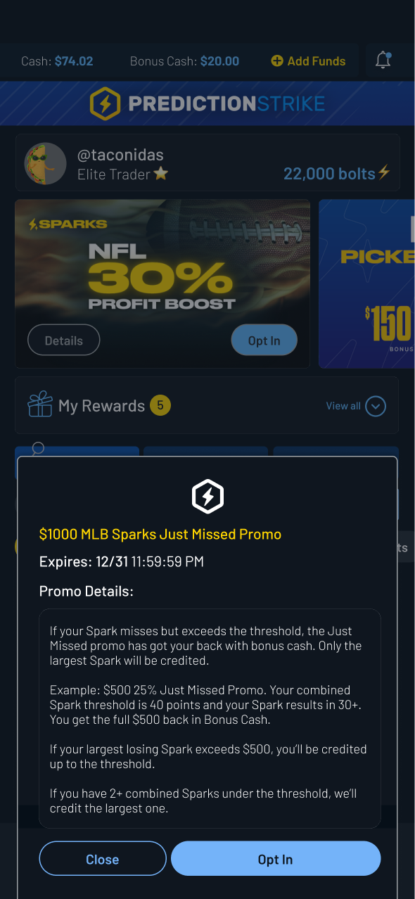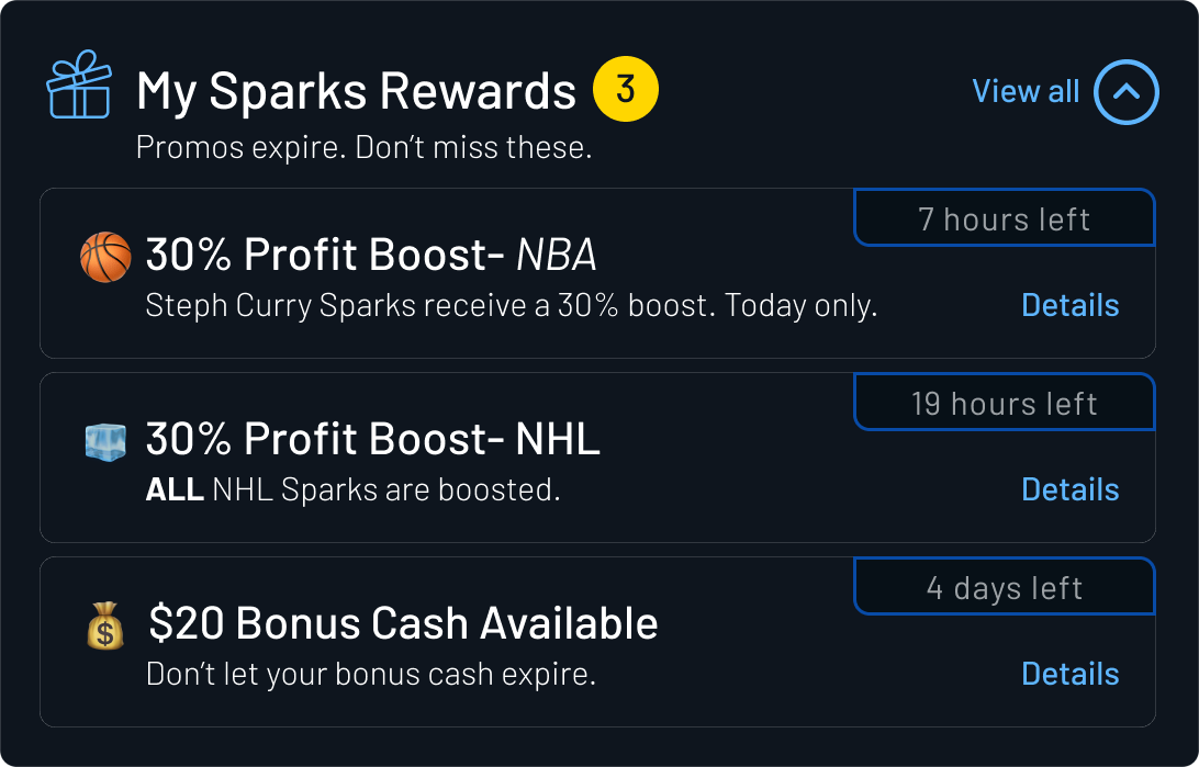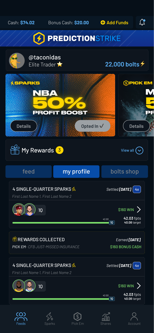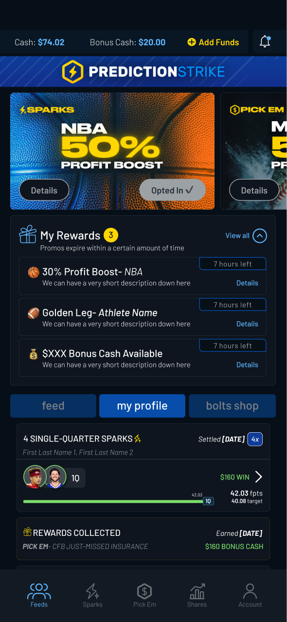 “My Rewards” elements were added across Feed, Sparks, Shares, and Pick Em.These views surfaced active promotions with clear expiration and eligibility details, making rewards immediately actionable.
