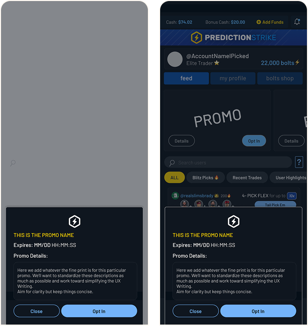 Promotions play an important role in engaging users and driving retention, but at PredictionStrike they were underperforming. While promotions existed across the product, they were inconsistently surfaced, difficult to understand, and often failed to clearly communicate value or reward status to users.